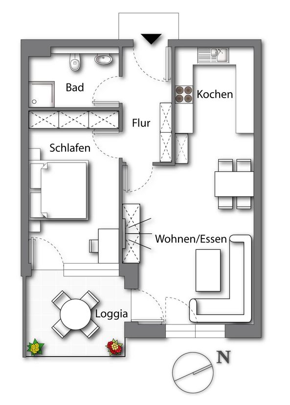 Die praktische Küchennische fügt sich harmonisch in den Raum ein und schafft kurze Wege im Alltag. Von hier aus gelangen Sie direkt auf den Balkon – ideal, um den Morgenkaffee in der Sonne zu genießen oder den Tag entspannt ausklingen zu lassen. Das gemütliche Schlafzimmer liegt direkt nebenan und verfügt ebenfalls über einen eigenen Zugang zum Balkon, was den Wohnkomfort zusätzlich steigert und für ein offenes, großzügiges Wohngefühl sorgt. Durch die Verglasung mit außen angebrachter Glasschiebetür lässt sich der Balkon je nach Wetter wie ein zusätzlicher Bereich nutzen.