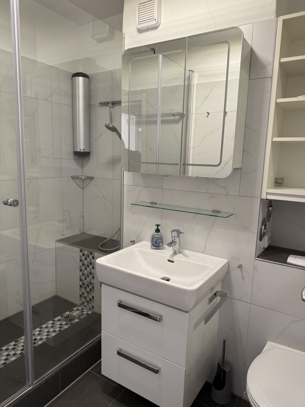 Das Badezimmer ist mit Dusche, Waschbecken und WC ausgestattet. Im Flur findet sich ausreichend Platz für eine Garderobe.