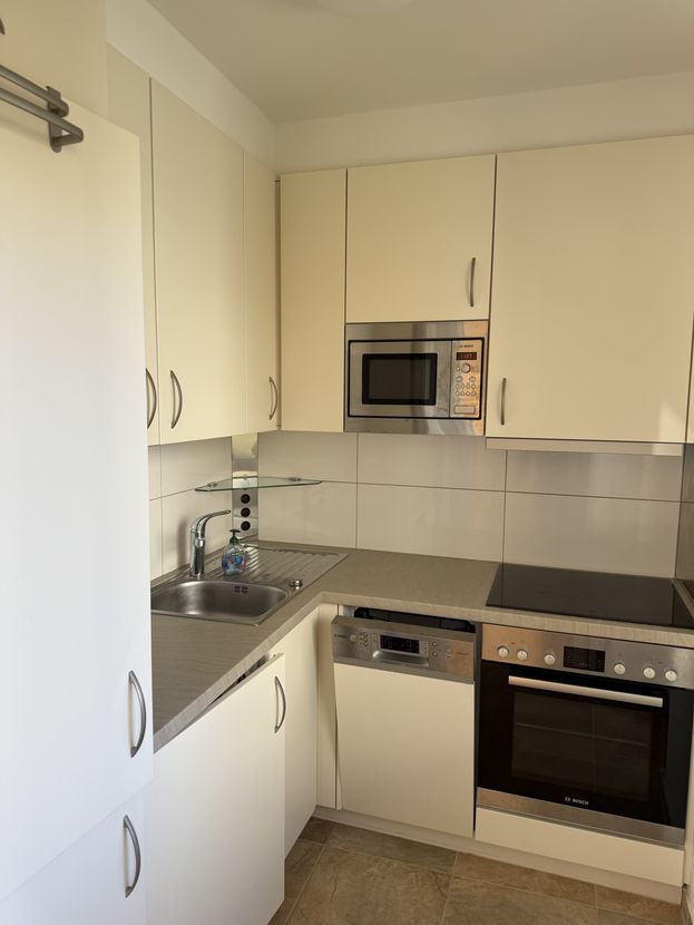Die angrenzende, kompakte Küche bietet alles, was man braucht – sogar eine Waschmaschine ist mit eingebaut.