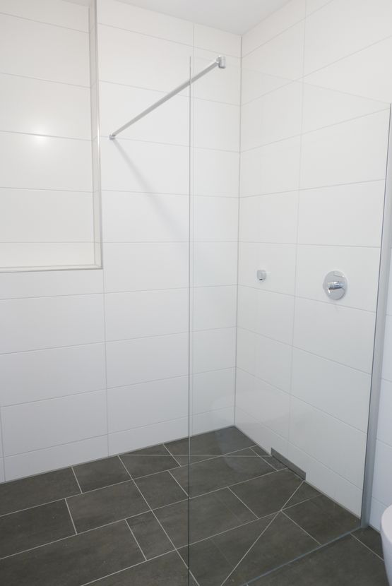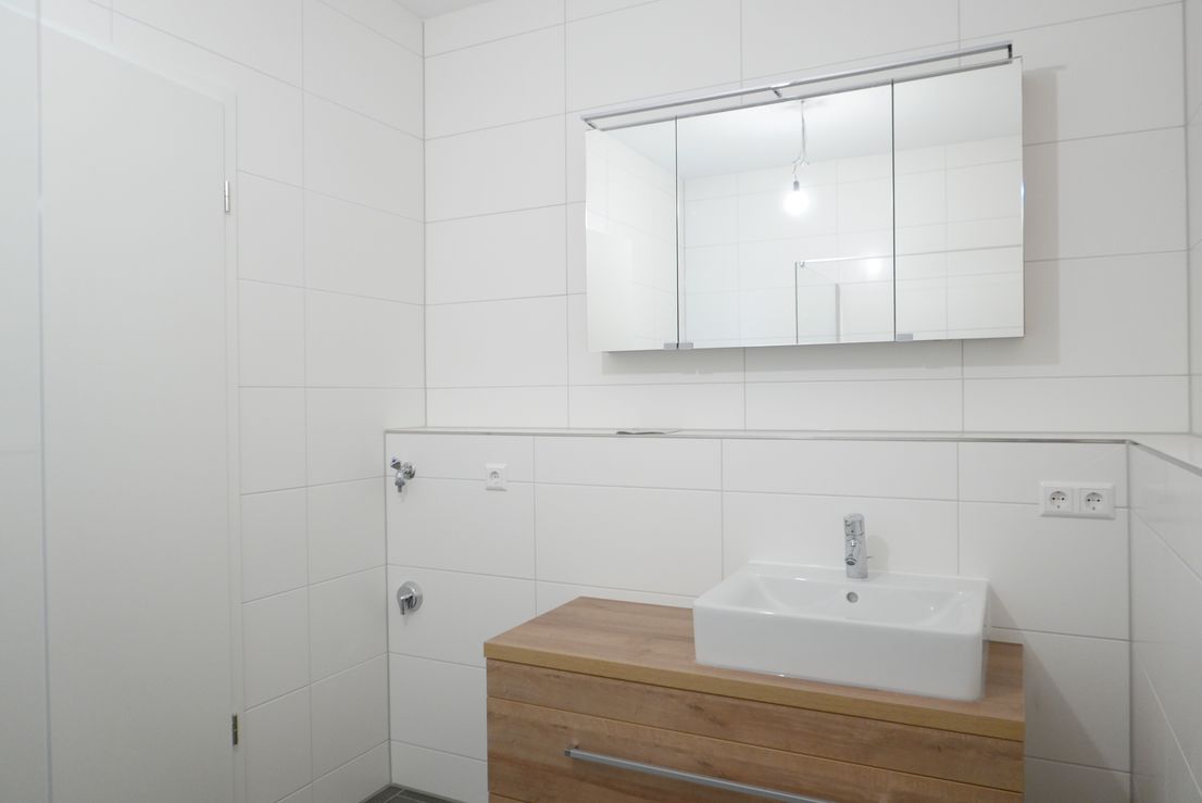 Angrenzend befindet sich ein geräumiges Schlafzimmer sowie ein modernes Badezimmer mit bodengleicher Dusche, Waschbecken, WC und Waschmaschinenanschluss.