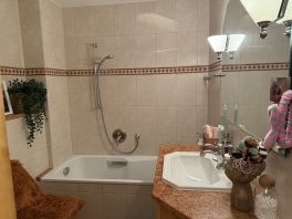 Das innenliegende Badezimmer ist mit Badewanne, Waschbecken