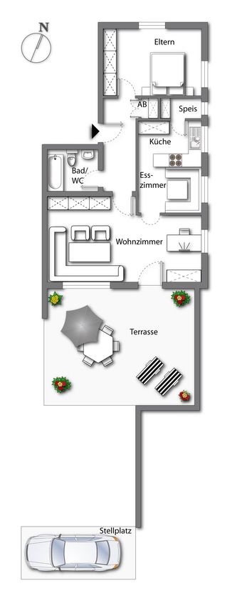 auch von der Küche aus zugänglich und führt direkt auf die große Terrasse, die viele Sonnenstunden ermöglicht und den Wohnraum ideal erweitert.