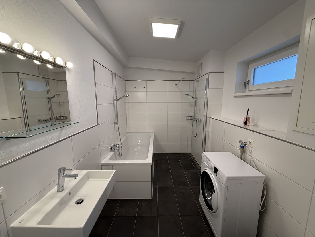 Das Badezimmer verfügt über ein Fenster sowie Badewanne, Dusche, Waschtisch und WC. Anschlüsse für Waschmaschine und Trockner sind vorhanden.