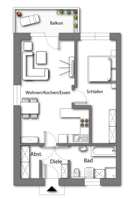 und lässt sich durch die vorhandene Schranknische gut strukturieren.