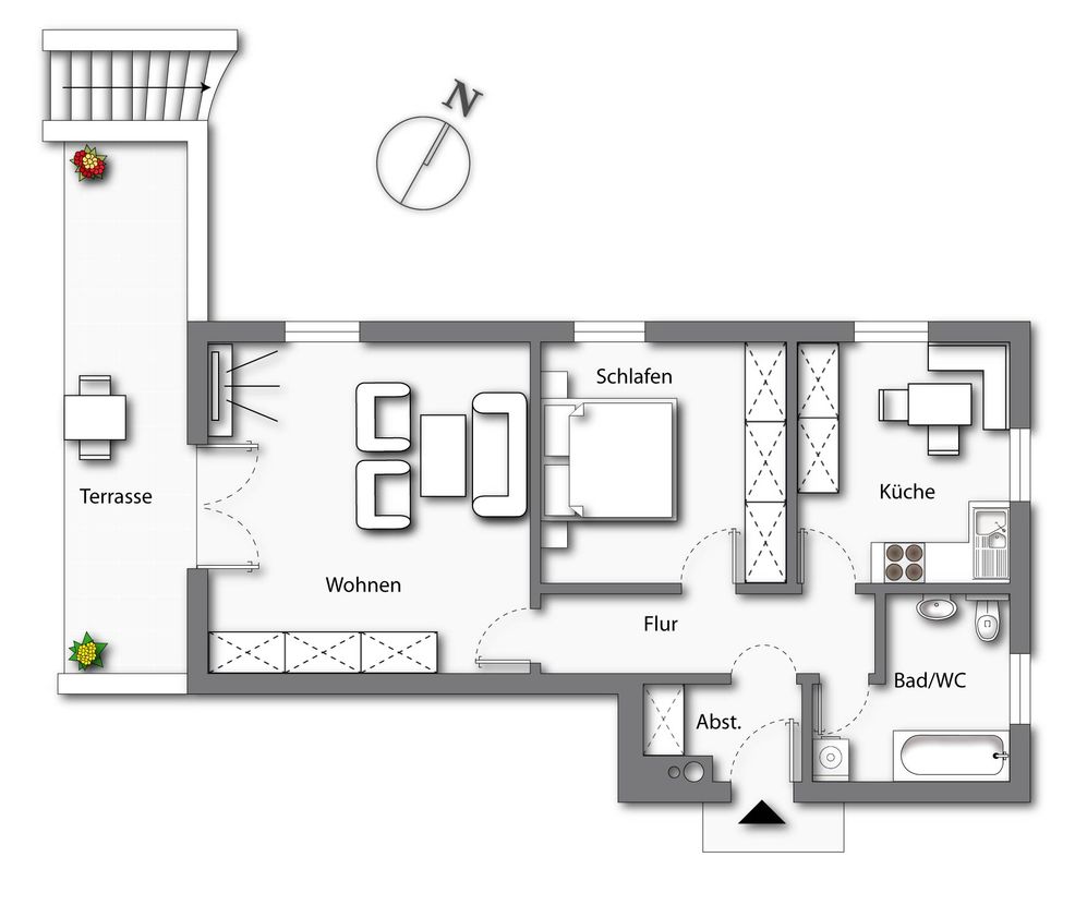 Die 2-Zimmer-Wohnung selbst ist praktisch geschnitten und bietet ein angenehmes Wohngefühl. Das großzügige Wohnzimmer führt direkt auf die Terrasse mit